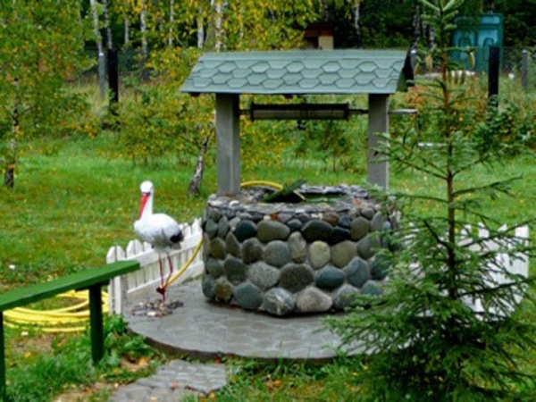 Декоративный, практически игрушечный, вид традиционного колодца из бетонного кольца и деревянной крыши дает простор для фантазии. Вариант прост, но облицовка камнем, плиткой, аккуратная укладка черепицы — сделает модель гвоздем ландшафта.