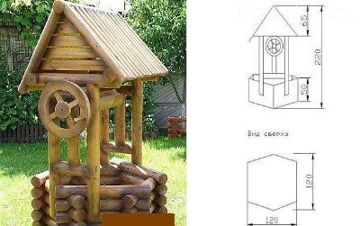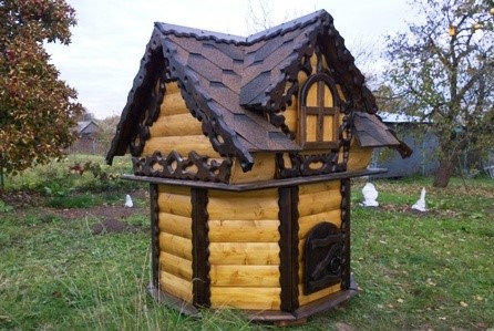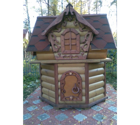 Эта постройка имеет малый размер, что особенно ценится при отсутствии свободной территории на участке. Дополнительным элементом декора служит колесо, установленное на ворот для поднятия воды. Высота готового домика составляет 2,2 м, а основание имеет диаметр 1,2 м.