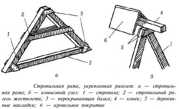 Крепление стропил усиливают с помощью монтажа укосин. Также для укрепления места стыковки стропил можно установить конек.