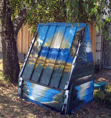 Если заниматься резьбой у вас не хватает времени, то можно использовать более простой и быстрый метод — декорирование при помощи лакокрасочных материалов. Так, домик можно окрасить в контрастные цвета, либо изобразить на нем целую картину с интересным сюжетом.