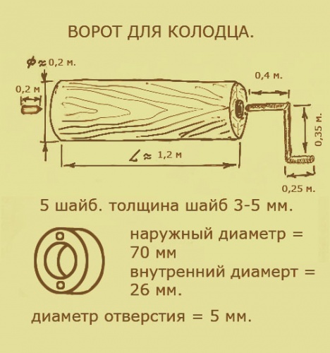 Следующим шагом является создание ворота для поднятия воды. Основанием ворота служит оцилиндрованное бревно, имеющее диаметр 20 см и более. Длина этого бревна должна быть меньше промежутка между стойками на 6-10 см, чтобы при прокручивании ворот за них не зацеплялся. Для исключения возможности деформации бревна, по бокам его обтягивают проволокой из металла. Далее в обоих торцах бревна, а также в стойках, делают отверстия диаметром 3 см. В вороте эти отверстия должны иметь глубину 5 см, а в стойках проходить насквозь. Кроме того, отверстия в вороте и на стойках должны размещаться напротив друг друга. Затем необходимо подготовить трубы для крепления ворота на стойки. Для этого можно использовать водопроводную трубу или металлические стержни радиусом 12 мм. Одну трубу вставляют сквозь правую стойку в правый торец ворота. Эта труба остается прямой и может иметь любую длину.