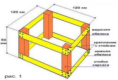 Первый шаг — это подготовка четырех стоек, шириной 8 см. Далее потребуются обрезные доски шириной 12 сантиметров и подходящей, для обвязки стоек, длинной. Доски поочередно прибиваются к стойкам гвоздями, длина которых должна быть не менее 10 см. Такие гвозди позволят надежно соединить детали между собой. В результате проделанной работы должен получиться устойчивый и прочный каркас.