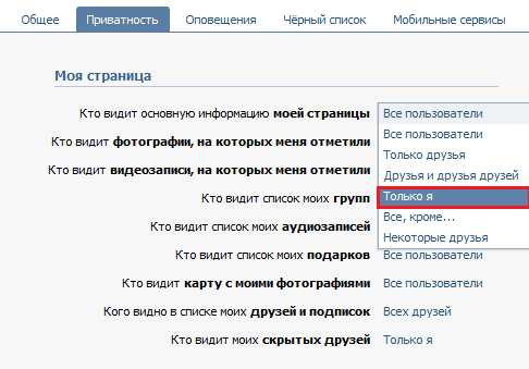 Вместо вкладки «Общее» выбираем «Приватность». Здесь мы видим целый список настроек. В каждой из них необходимо выбрать пункт «Никто» или «Только я». Это поможет вам закрыть свою страницу от незнакомых людей, запретит присылать вам сообщения в личку, спрячет информацию о вас. И еще — не забудьте сохранить настройки, иначе они не сохранятся.