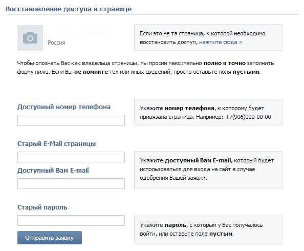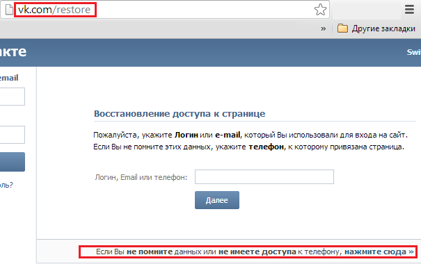 Если ваши данные были изменены или вы не помните телефон, который привязали к странице, кликните по ссылке в самом низу формы, где написано «нажмите сюда»;