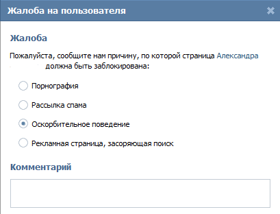 - Среди списка причин для жалобы нужно отметить «Оскорбительное поведение». В комментарии к причине надо как можно точнее и подробнее рассказать о проблеме со взломом вашей страницы. Пользователя заблокируют за 3-7 дней.