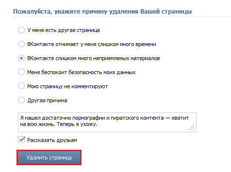 В открывшемся окне с надписью «Пожалуйста, укажите причину удаления Вашей страницы» — выбираете понравившийся вариант, пишете комментарий — если есть желание порадоваться этим праздником, ставите галочку возле «Рассказать друзьям», можете и не ставить, это уже на ваше усмотрение. Теперь, нажимаете кнопку «Удалить страницу».