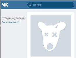 - Ввести логин и пароль удалённого профиля. Откроется страница с извещением, что ваша страница была удалена. Вместо аватарки будет стандартный для заблокированных и удалённых аккаунтов логотип в виде карикатурной мёртвой собаки.
