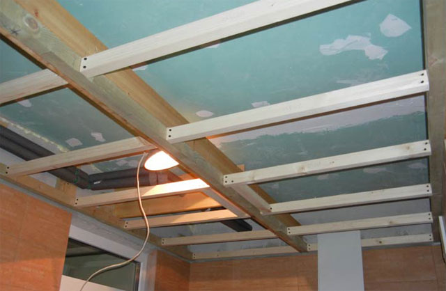 Деревянные бруски желательно использовать в сухом помещении и с достаточно ровным черновым потолком. Возможна и комбинация этих двух способов, для этого в системе из деревянных брусков применяют крепление с помощью металлических подвесов. Метод непрактичный, т. к. приходится использовать бруски сечением не менее 5*5 см и идеально ровные.