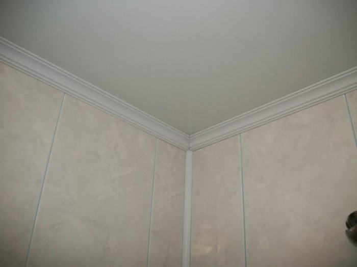 В качестве потолочного плинтуса в конструкции потолка ПВХ можно использовать, специально изготавливаемый для этих целей, пластиковый , который имеет паз для установки в него панелей. Плинтуса стоит брать с небольшим запасом примерно на 1 м больше, чем периметр потолка, т. к. в процессе монтажа его придется запиливать под углом и можно допустить ошибку.