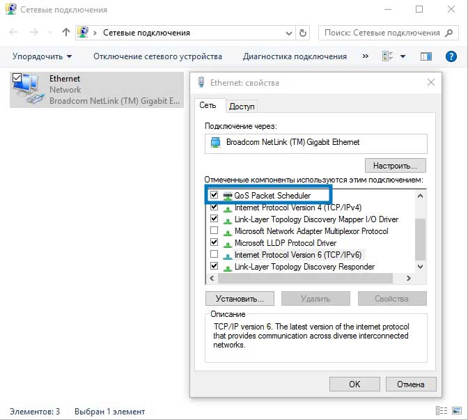 Теперь необходимо проверить, присутствует ли планировщик QoS в вашем сетевом подключении. Для этого следует зайти в «Панель управления», затем в «Центр управления сетями» – «Изменить доп. параметры доступа» и выбрать адаптер, через который вы пользуетесь подключением (он будет активным, а не серым). Теперь переходим в «Свойства» и проверяем, стоит ли галочка напротив опции «Планировщик пакетов QoS».