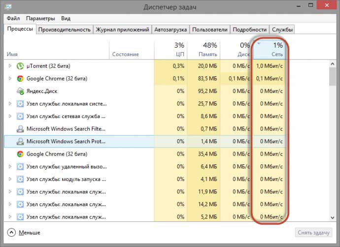 В открывшемся окне необходимо перейти во вкладку «Процессы», далее кликаем на «Сеть». На скриншоте показан пример с запущенными приложениями, которые используют трафик. К примеру, больше всего скорости требуется для uTorrent, что не удивительно, после него идет браузер. Остальные программы и службы интернет не используют.