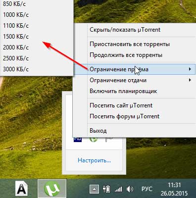 Нажимаем на иконке программы правой кнопкой мыши. Переходим в «Пункт Ограничением приема» – нажимаем на пункт «Не ограничено», чтобы использовать максимальную скорость интернета для загрузки файлов.