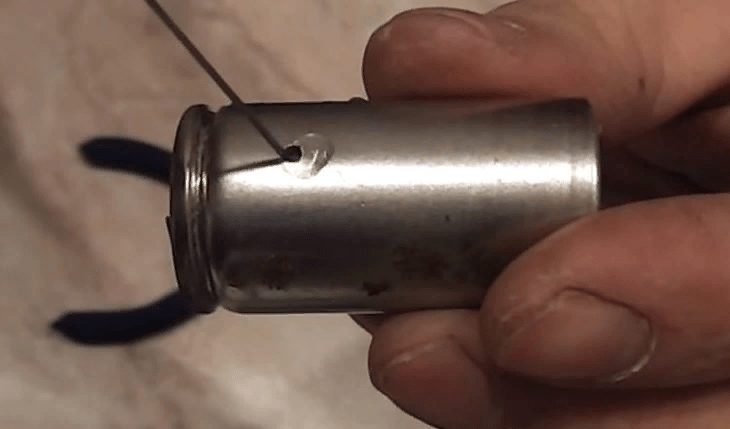 Шаг первый: сделать едва заметное отверстие в неработающей банке (где располагается минусовой контакт) с помощью тончайшего сверла.