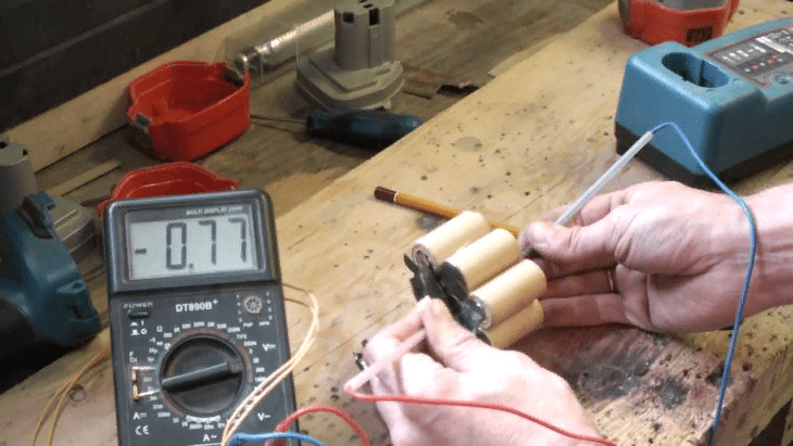 Шаг четвертый: далее следует замерить авометром уровень напряжения каждой банки. Для никель-кадмиевых и никель-металлогидридных источников должно быть напряжение около 1,3 В. Для литий-ионных банок заряд составляет – 3,7 В. Рекомендуется подписать уровень напряжения каждой батареи, чтобы не перепутать их.