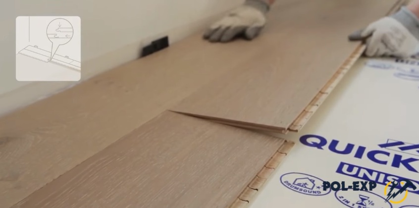Тонкие паркетные доски легко прогибаются, что усложняет соединение замка. С таким материалом лучше работать вдвоем.