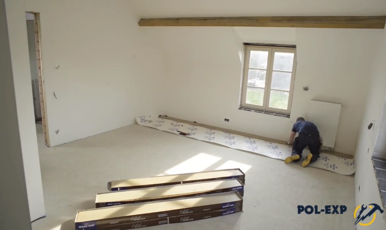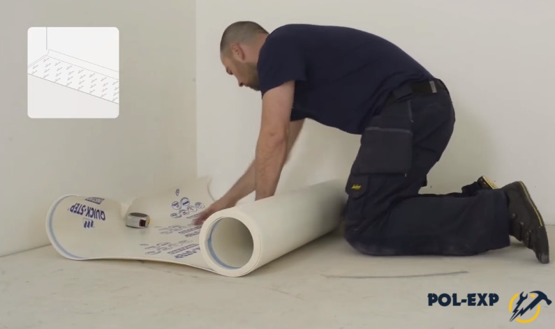 Шаг 6. Уложите на пол подкладку, следите, чтобы не было складок и пропусков. Этот же материал можно использовать в качестве демпферной ленты, для этого нужно отрезать полоски или немного заворачивать его на стену.