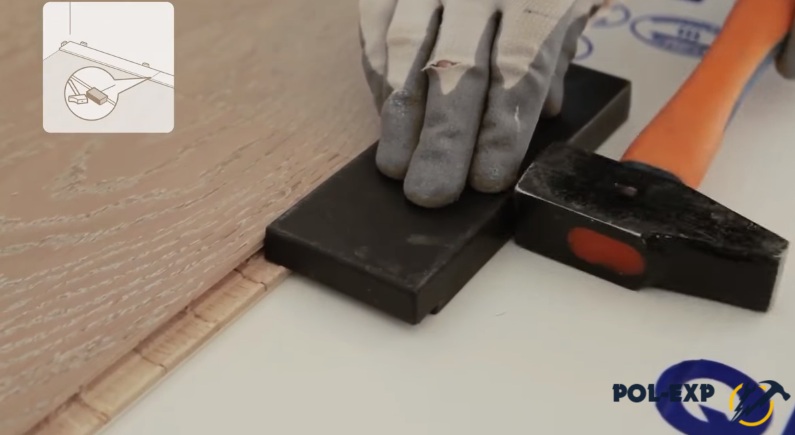 Шаг 9. Планки соединяйте в замки до упора и щелчка. Для добивания нужно пользоваться специальными приспособлениями, в противном случае велики риски повреждения замков. Приспособление ставится вплотную к верхней ровной кромке ламели, с противоположной стороны по нему наносятся удары молотком. Работайте осторожно, не повреждайте покрытие.