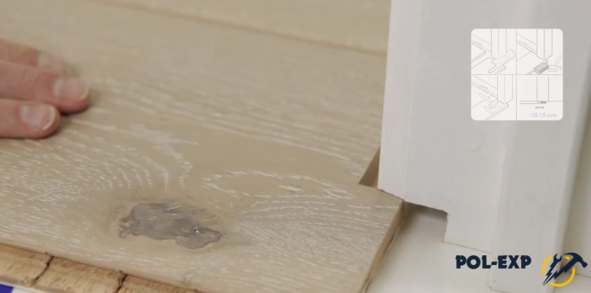 Шаг 8. Работать начинайте от противоположной дверному проему стены. Между досками и стенами обязательно оставляйте зазор шириной 10–15 мм, он нужен для компенсации тепловых расширений покрытия. Для контроля зазора можно использовать небольшие отрезки паркетной доски.