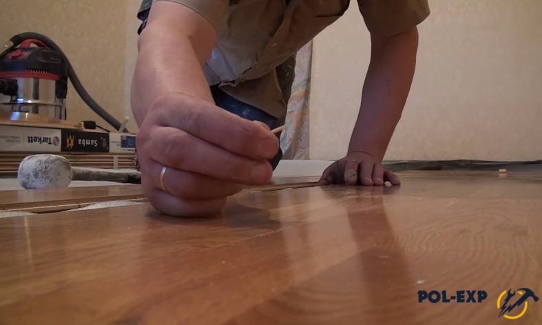 Шаг 3. Для отделки отопительных труб в досках нужно вырезать продольные отверстия. Затем они заделываются вставками, швы между элементами шпаклюются в цвет паркетной доски. По бокам отрезков наносятся жидкие гвозди.
