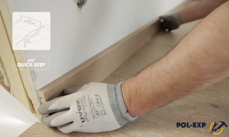 Шаг 11. Прикрепите плинтусы. С обратной стороны намажьте их жидкими гвоздями и плотно прижмите к стене.