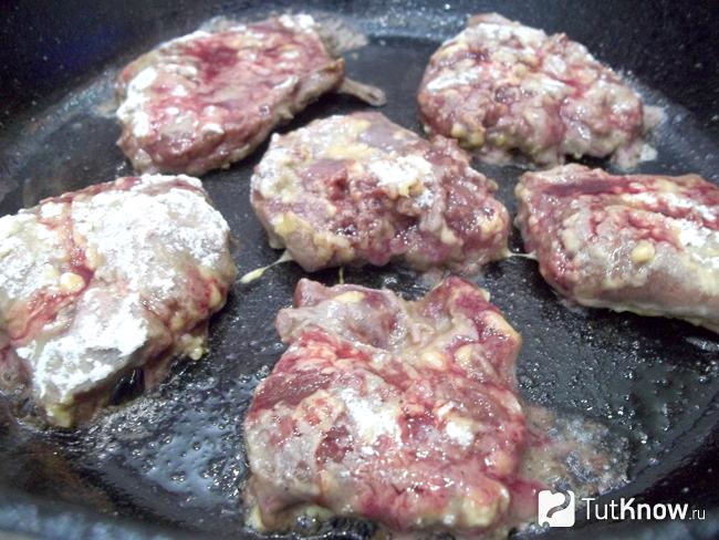 6. Куски говяжьего сердца выложите на раскаленную сковороду с растительным маслом. Обжаривайте их на сильном огне по 3-5 минут с каждой стороны до румяности.