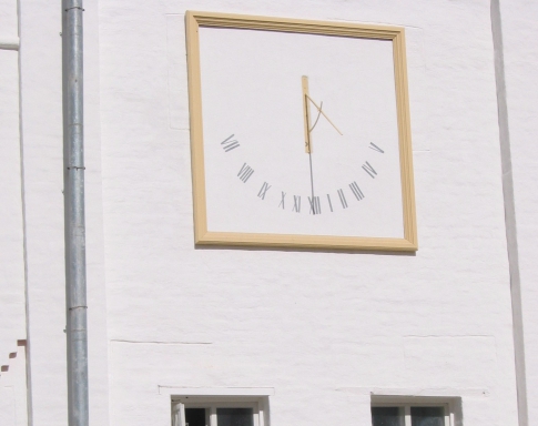 Вертикальные солнечные часы лучше размещать на южной стороне. Изготовление этого типа солнечных часов более сложное, чем первых двух. Циферблат располагается параллельно горизонту в строгом южном направлении для северного полушария. Чуть выше центральной части основания определителя времени нужно отметить расположение стрелки, и от этой точки спустить отвес, по которому нужно начертить линию. Эта линия будет обозначать время полудня. Числовые обозначения располагаются на циферблате симметрично только в том случае, если при этом стержень окажется в строго перпендикулярном положении относительно циферблата. Закрепить стержень в стене не так просто: для начала нужно просверлить отверстие большим, чем гномон, диаметром. Часть стержня, которая будет закреплена внутри стены, нужно немного расплющить для того, чтобы предотвратить его проворачивание. Место крепления увлажняется, туда вставляется стержень так, чтобы место изгиба было точно в стене. Стержень нужно повернуть так, чтобы он составлял угол 90 градусов с поверхностью стены до того, как раствор в месте крепления застынет.
