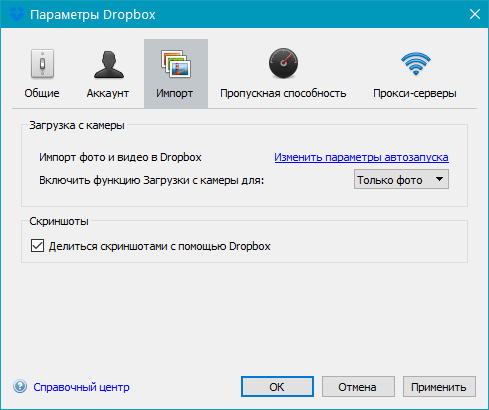 Перейдя во вкладку «Импорт», вы можете настроить импорт контента с мобильных устройств, подключаемых к ПК. Активировав функцию загрузки с камеры, вы можете добавлять в Дропбокс фото и видеофайлы, хранящиеся на смартфоне или цифровой камере.