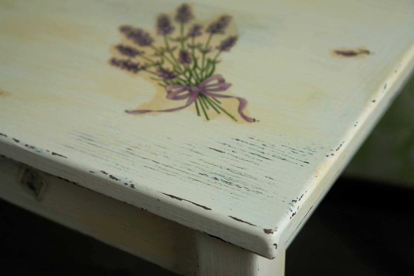 Декупаж стола в стиле прованс своими руками будет выглядеть более натурально, если края рисунка или самого изделия скрыть, оформив патинированием пастельным или металлическим цветом. Тогда рисунок как бы проявится из общего фона.