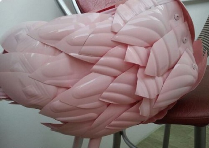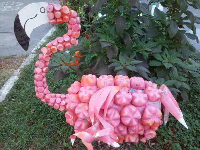 Создание фламинго относится к работам средней категории сложности. По сравнению с другими пернатыми из пластиковых бутылок здесь меньше хлопот с вырезанием и креплением перьев за счет их больших размеров. Но потрудиться все же придется.