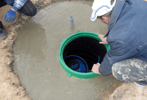 Опускание в котлован, крепление синтетическими фалами к плите, герметизация стыка с обсадной трубой, присоединение труб для воды и кабеля (или установка заглушек с наружной стороны).