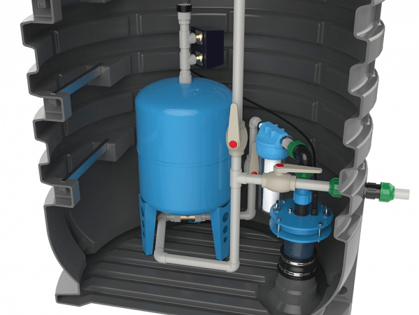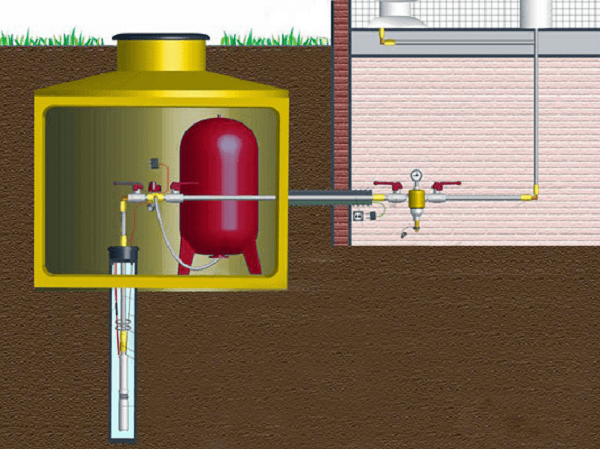 Во внутренней части кессона можно расположить запорную арматуру, насос и иные составляющие системы, среди которых: автоматика управления насосом, различные фильтры, измерительные приборы, расширительный бак, последний из которых может располагаться и в самом доме. Без допустимо обойтись, если скважина размещена недалеко от отапливаемой постройки. Данный вариант, стоит признать, во многом удобнее, ведь так хозяин в любое время сможет иметь доступ к узлам системы. Однако такое расположение кессона обладает и своими минусами, которые заключаются в громоздкости оборудования и его шумной работе.