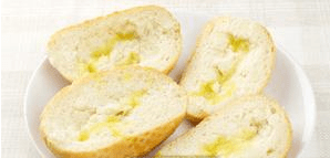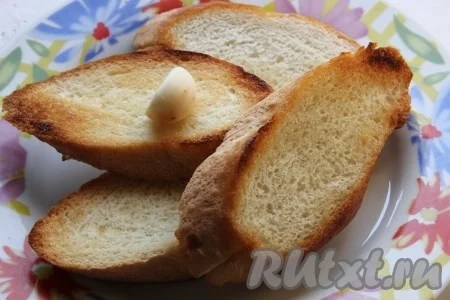- Кусочки цельнозернового хлеба немного подсушивают и сдабривают оливковым маслом.