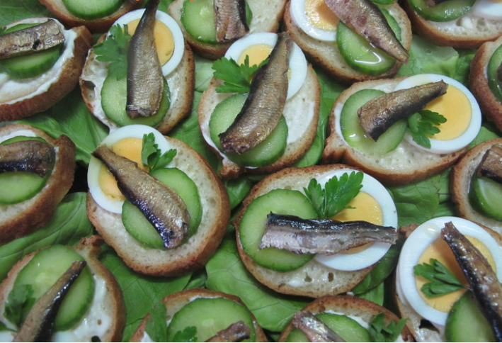 Если говорить о каких-то традиционных праздничных блюдах, то, конечно, на ум сразу приходят бутерброды со шпротами на праздничный стол. Рецепты с фото даже этой распространенной закуски могут сильно отличаться. Так, некоторые готовят бутерброды со шпротами только с белым хлебом, поджаривая каждый кусок на сухой сковороде с двух сторон. Другие делают такие бутерброды исключительно черным бородинским хлебом. Опять же, кто-то обязательно кладет к рыбе свежий помидор, другие предпочитают соленый огурец, а третьи останавливают свой выбор на дольке лимона.