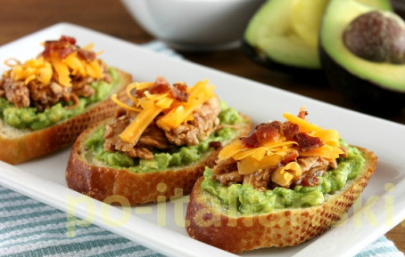 Ингредиенты:— хлеб — 2 ломтика,- авокадо — 1/2 шт.,- помидоры — 2 шт.,- сладкий перец — 1 шт.,- луковица — 1/2 шт.,- чеснок — 1 зуб.,- соль,- лимонный сок — 1/2 ст. л.,- сыр.
