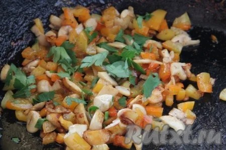 - Пучок укропа мелко крошат и отправляют на продукты сверху.