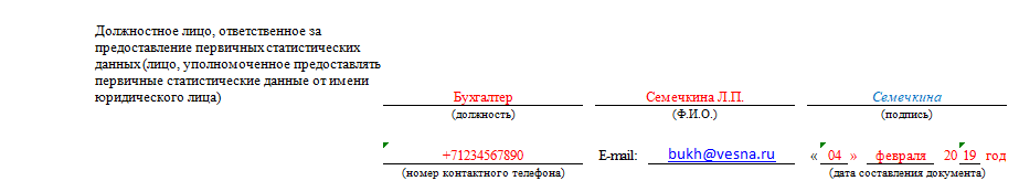 В конце отчет должен подписать бухгалтер, который его заполнял. Также нужно проставить дату заполнения и указать электронную почту и номер телефона.