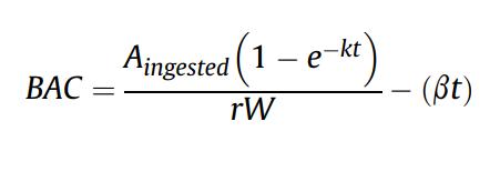 где: BAC — концентрация алкоголя (г/л); t — время, прошедшее с момента употребления; A — масса чистого этанола в напитке (г); r — фактор Видмарка; W — вес тела (кг); k — константа скорости поглощения алкоголя (h -1); b — скорость выведения алкоголя ((г/л)/h);