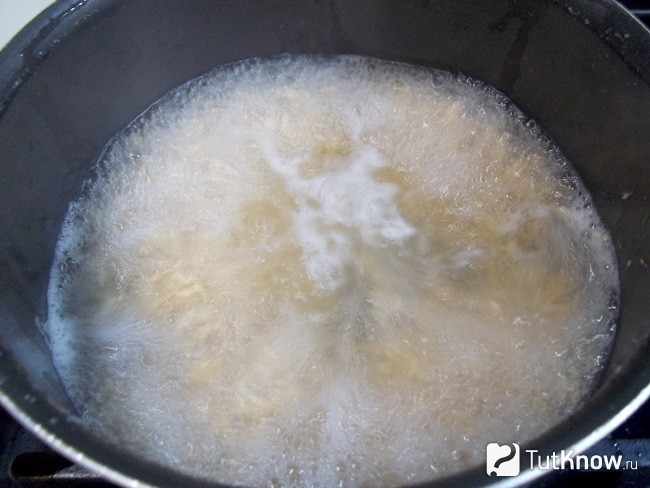 Овес вместе с водой переливаю в толстостенную кастрюльку, ставлю на плиту и жду закипания. Как только начинает кипеть, убавляю огонь до минимума. Доводить до кипения не стоит. Густой настой вспенится и «убежит» похлеще молока. От того и крышкой кастрюлю не стоит закрывать. Вообще лучше всего, конечно такую кашу лучше томить без кипения в духовке.
