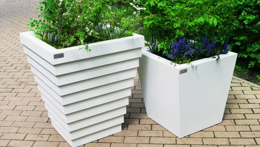 Металлические кашпо, такие как из нержавеющей стали или алюминия, придают современный и стильный вид. Они долговечны и устойчивы к внешним воздействиям, но могут перегреваться на солнце, что может негативно сказаться на растениях. Поэтому их лучше использовать в тени или с защитой от прямых солнечных лучей.