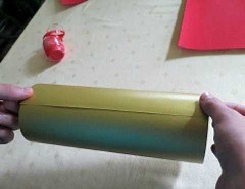 - Нужно быть аккуратными, так как заготовка наша довольно хрупкая, несмотря на скотч, которым мы предусмотрительно проклеили края. Теперь начинается самое интересное – пришло время соединить части нашего будущего фонарика. Заготовку из красной бумаги аккуратно надеваем на золотой цилиндр – очень осторожно, чтобы случайно не разорвать полоски. Вот как выглядит этот процесс: