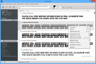 Данный менеджер шрифтов поддерживает русский язык, позволяет как угодно сортировать и просматривать шрифты на Вашем компьютере (даже не установленные). При этом очень полезной особенностью является то, что все шрифты в выборках без необходимости их установки можно использовать в любых программах, и они будут доступны пока запущен NexusFont. Это может быть очень удобно, если Вам приходится подбирать шрифты, но нет желания их все устанавливать.