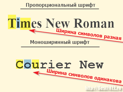 Моноширинные же шрифты получили своё название из-за того, что ширина символов (в том числе пробелов и даже знаков препинания) в них примерно одинаковы (при несовпадениях разница обычно компенсируется за счёт небольших пустых областей вокруг литеры).