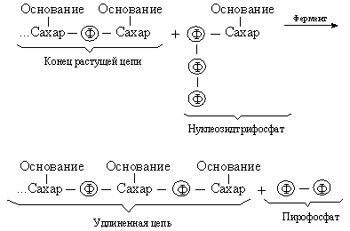 Поскольку ДНК-полимераза присоединяет очередной нуклеотид к ОН-группе в 3″-положении предшествующего нуклеотида, цепь постепенно удлиняется на ее 3″-конце.