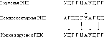 Так образуются две новые двойные спирали с той же последовательностью оснований, что и у исходной ДНК. Иногда в процессе репликации происходит «сбой», и возникают мутации (см. также НАСЛЕДСТВЕННОСТЬ).В результате транскрипции ДНК образуются клеточные РНК (мРНК, рРНК и тРНК):Они комплементарны одной из цепей ДНК и являются копией другой цепи, за исключением того, что место тимина у них занимает урацил. Таким способом можно получить множество РНК-копий одной из цепей ДНК.В нормальной клетке передача информации осуществляется только в направлении ДНК® ДНК и ДНК® РНК. Однако в клетках, инфицированных вирусом, возможны и другие процессы: РНК® РНК и РНК® ДНК. Генетический материал многих вирусов представлен молекулой РНК, обычно одноцепочечной. Проникнув в клетку-хозяина, эта РНК реплицируется с образованием комплементарной молекулы, на которой, в свою очередь, синтезируется множество копий исходной вирусной РНК:Вирусная РНК может транскрибироваться ферментом- обратной транскриптазой- в ДНК, которая иногда включается в хромосомную ДНК клетки-хозяина. Теперь эта ДНК несет вирусные гены, и после транскрипции в клетке может появиться вирусная РНК. Таким образом, спустя длительное время, в течение которого никакого вируса в клетке не обнаруживается, он снова в ней появится без повторного заражения. Вирусы, генетический материал которых включается в хромосому клетки-хозяина, часто являются причиной рака.