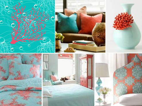 Коралловый цвет отлично сочетается с голубым, причем, в отличие от сочетания голубого и красного, для сочетания голубого и кораллового не нужно подбирать цвета одинаковой яркости, как видно на фото ниже.