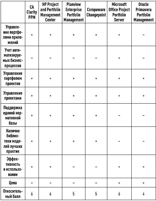 В 2010 году с участием авторов книги был выполнен большой объем работ по сравнению подобных инструментальных систем. Вначале на основании данных из открытых источников (в частности, отчета Gartner Group ) отобрали шесть инструментальных систем ведущих разработчиков: CA Technologies (продукт CA Clarity PPM), Hewlett-Packard Development Company (продукт HP Project and Portfolio Management Center), Planview Inc. (продукт Planview Enterprise Portfolio Management), Compuware Corporation (продукт Compuware Changepoint), Microsoft Corporation (продукт Microsoft Office Project Portfolio Server), Oracle Corporation (продукт Oracle Primavera Portfolio Management).