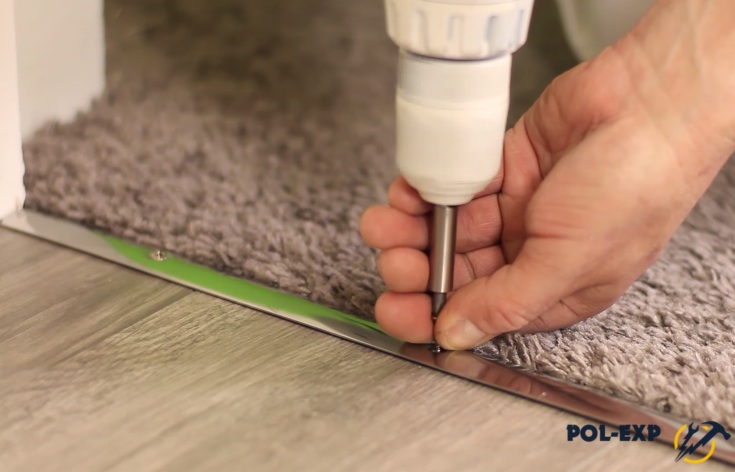 Шаг 7. У порога кромку ковролина нужно закрыть специальной металлической планкой – порожком, который не только защитит материал от растрепывания, но и придаст более эстетичный вид. Порожек фиксируется шурупами к основанию пола так, чтобы край планки плотно прижимал кромку ковролина на ширину не менее 5 мм.