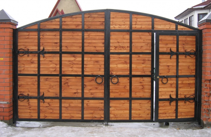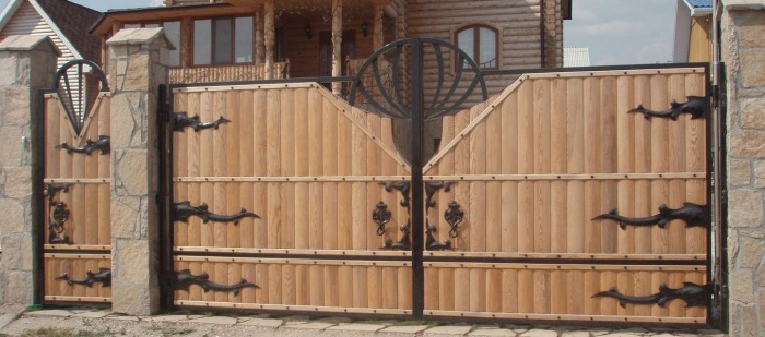 Если вы хотите сделать ворота с ковкой, украшения прикрепляют после высыхания второго слоя лака. Для прочности промазывают стыки металла и дерева герметиком. Для более долгой службы деревянных ворот их покрывают олифой и масляной краской.