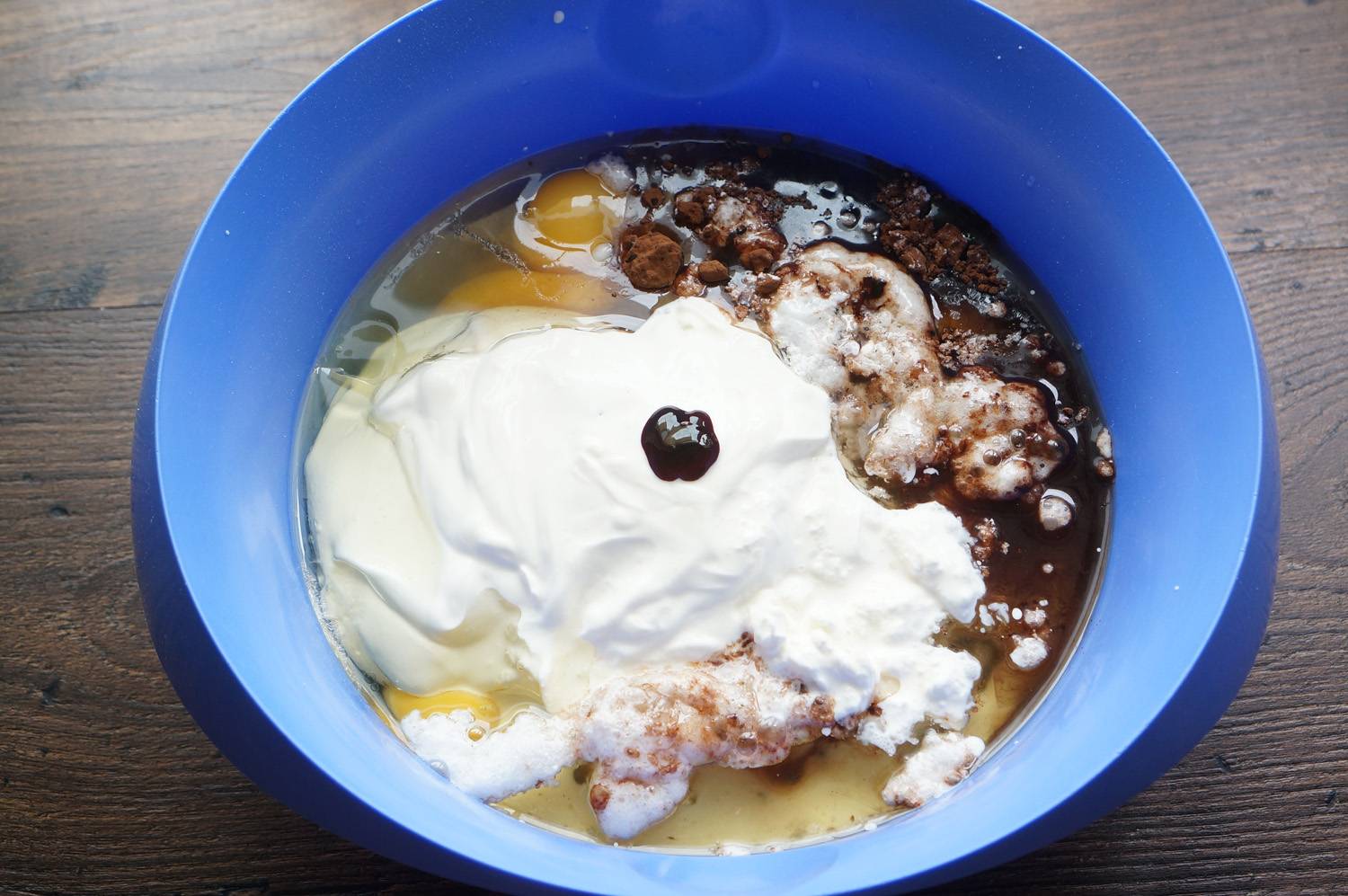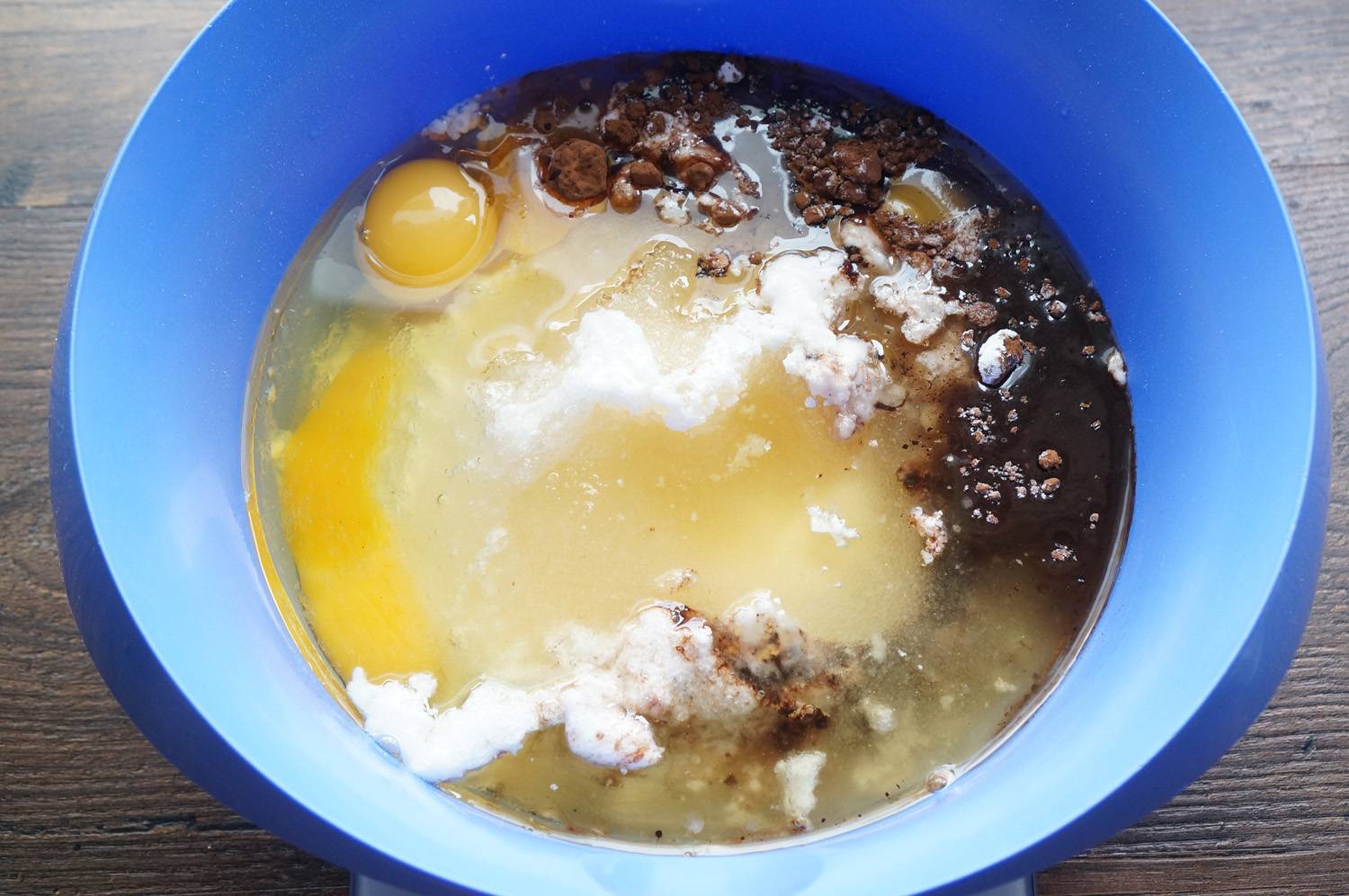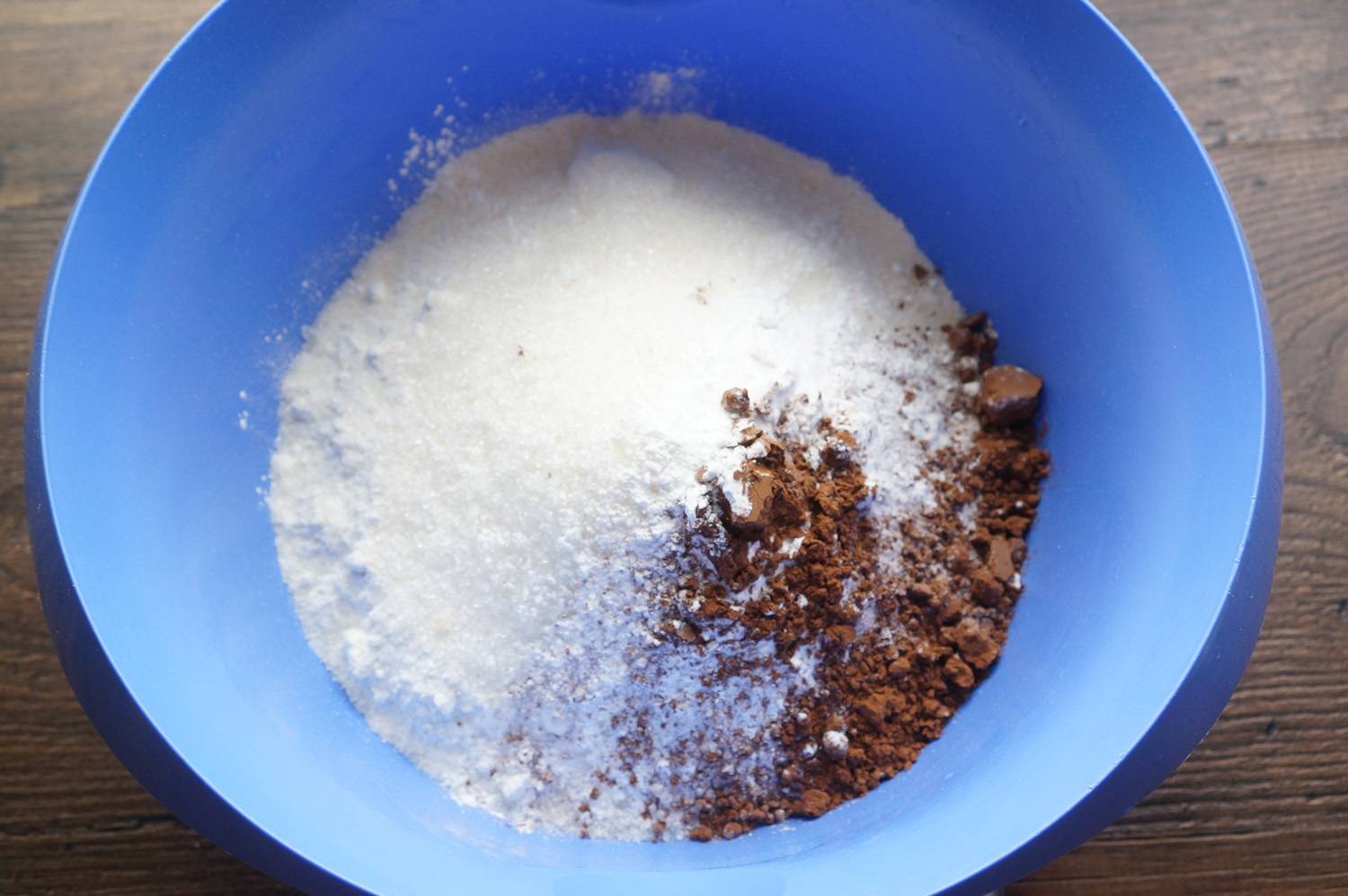 В чаше смешайте муку (340 гр.), сахар (300 гр.), алализованое какао (5 г), 1/4 ч.л. соли, соду (3 г), разрыхлитель (5 г).