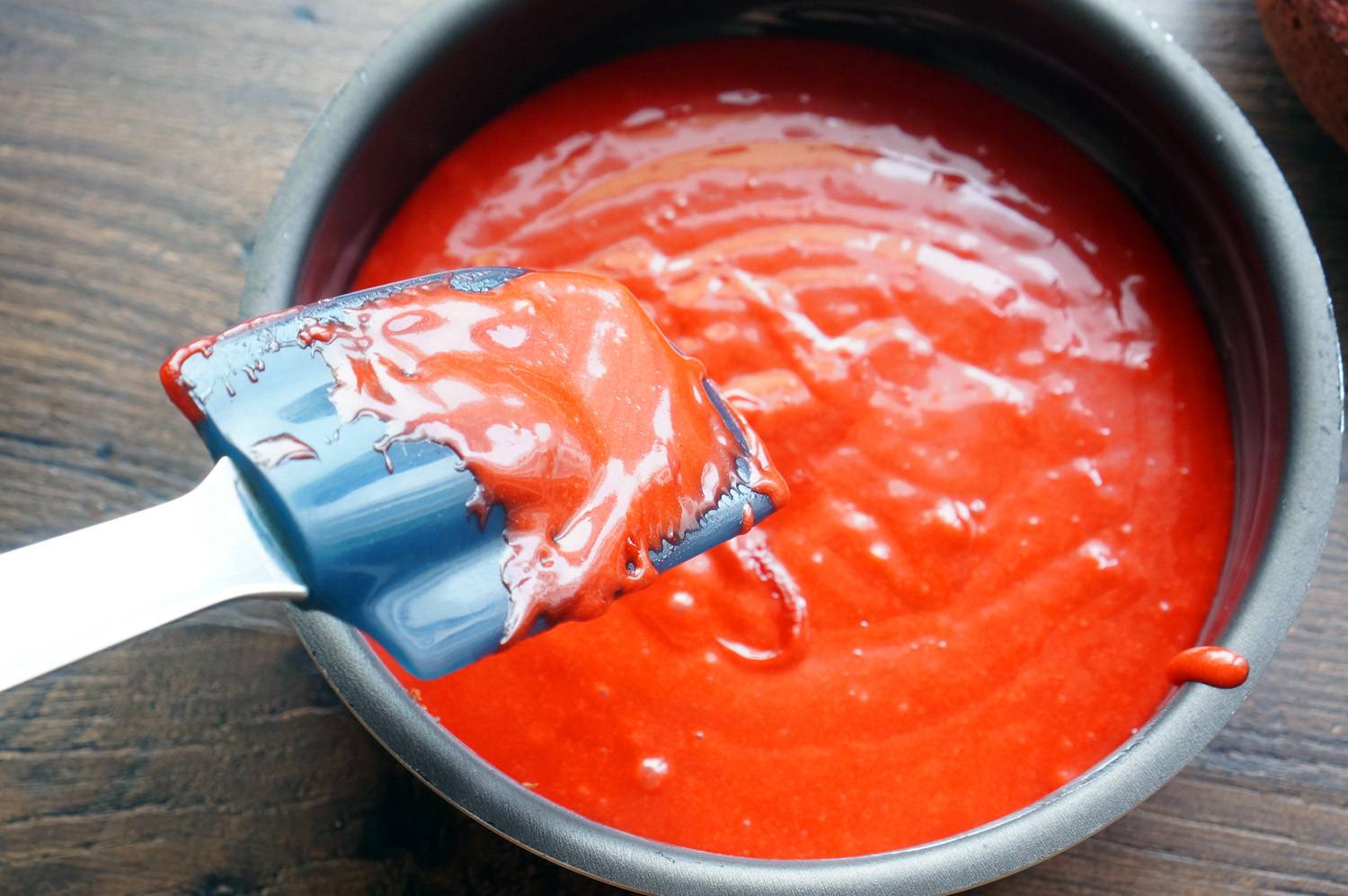 12. Нужный цвет – насыщенно красный. Но также учтите, что при выпекании коржи совсем чуть-чуть посветлеют, так как пигмент будет выгорать.